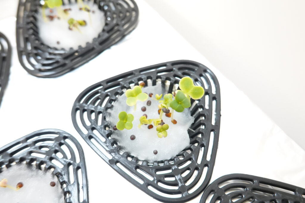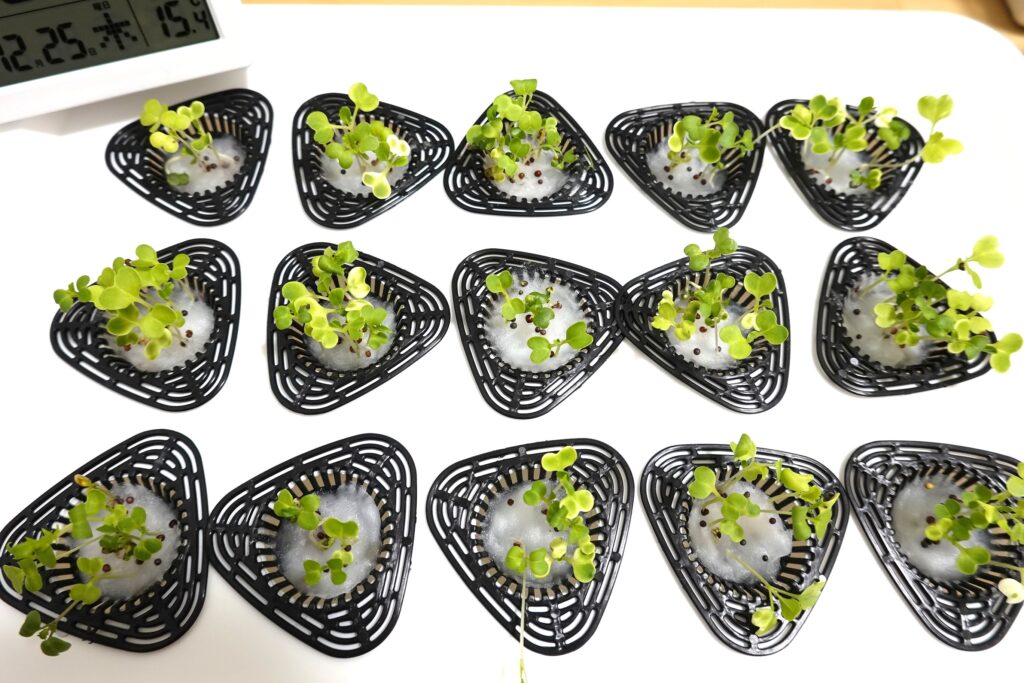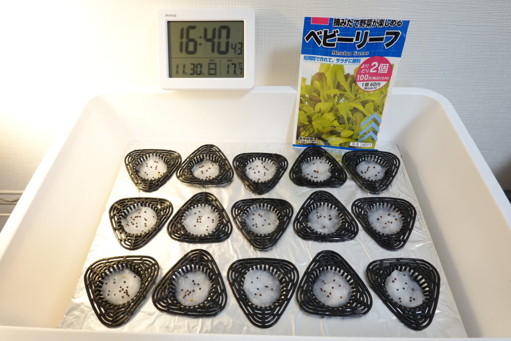鉢植えネットに水槽用ウールを入れ、種をまいて自作したA4サイズの発泡スチロール蓋にセットして栽培をスタートしました。