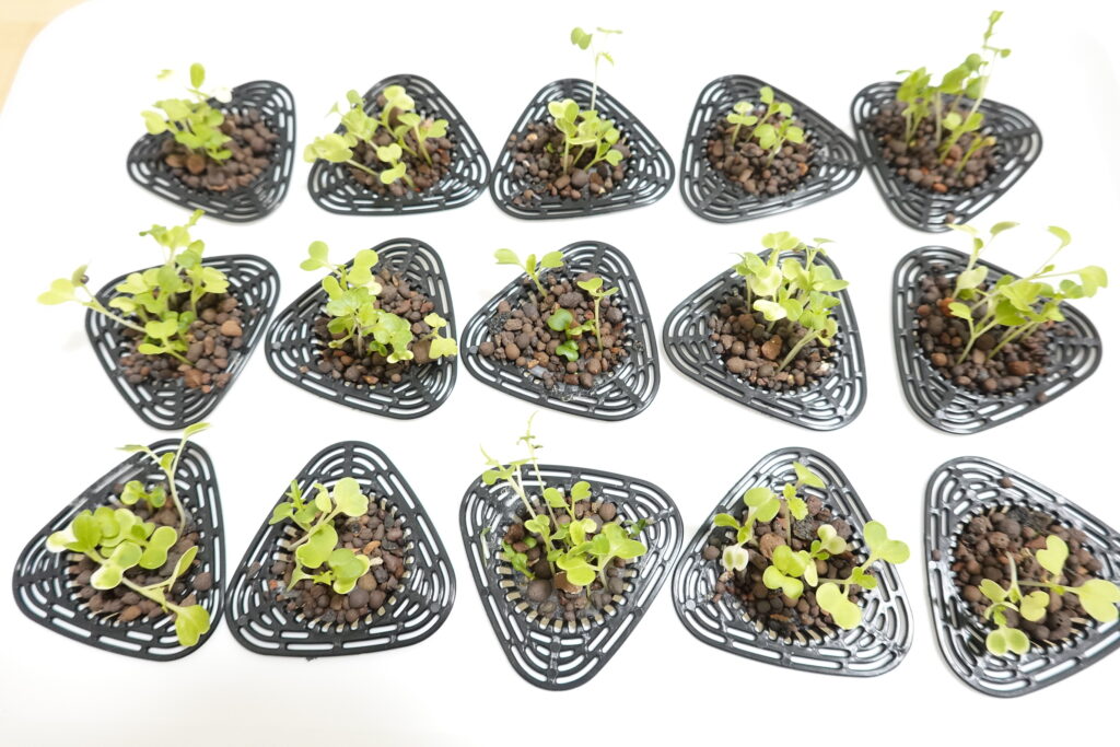 双葉が生えそろってきました。まだ発芽していない種も見えますが、発芽の見込みなしと考え、取り除き、ハイドロボールを入れます。