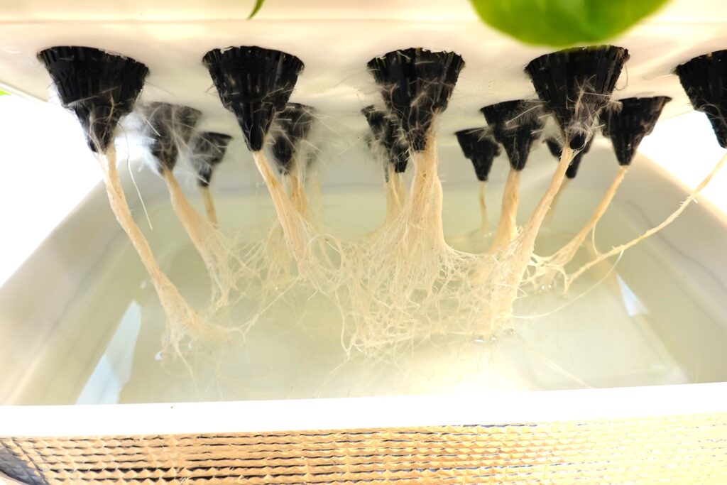 発芽後、根が十分に伸びたタイミングで、より安定するプラスチック蓋へ変更しています。養液はハイポネックスを1000倍に希釈して使用し、水位は根が常に吸水できる高さを維持しました。