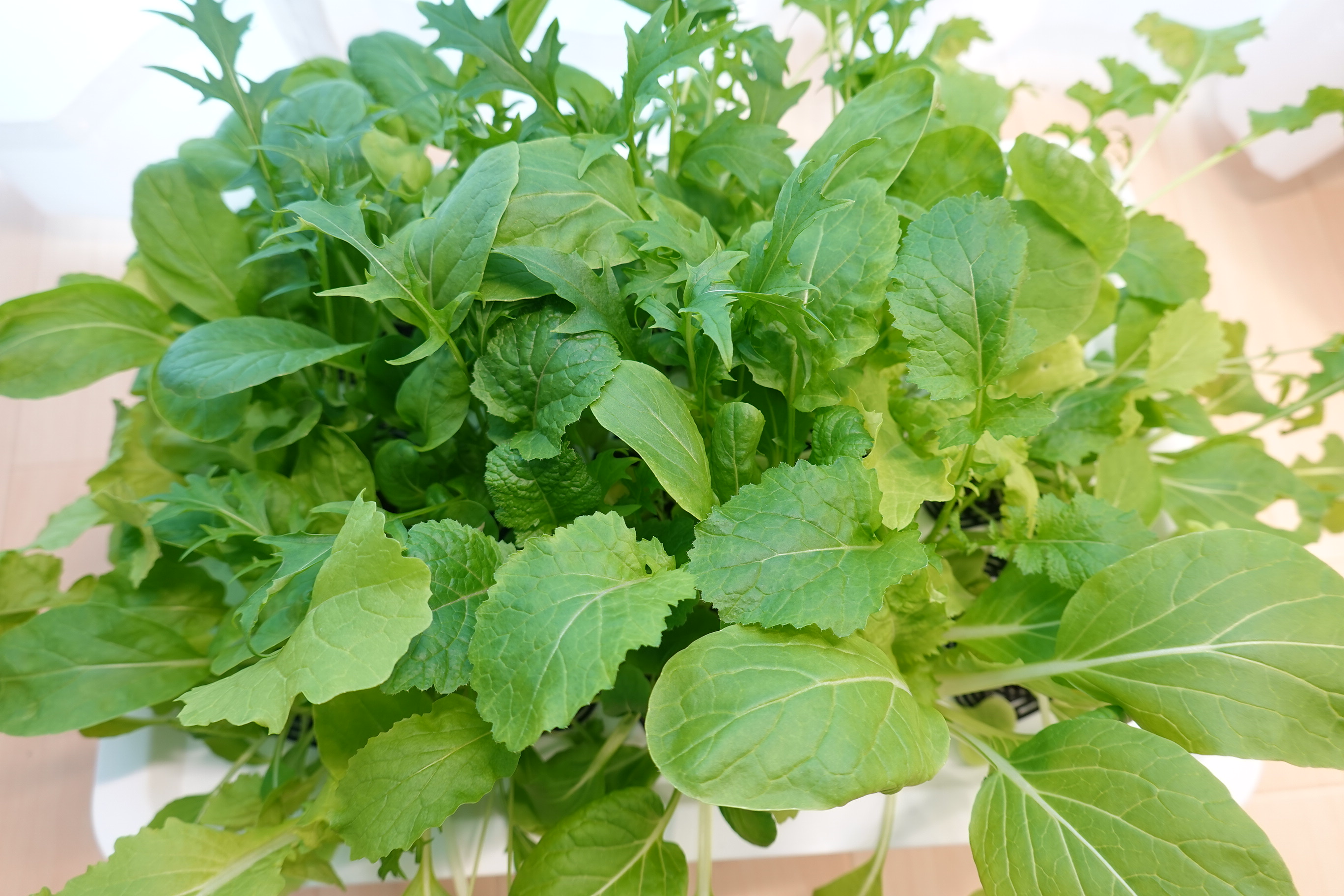 品種は小松菜、水菜、チンゲンサイ、からし菜など。パッケージ記載の8種類のうち、残りの3種の品種が気になりますね。