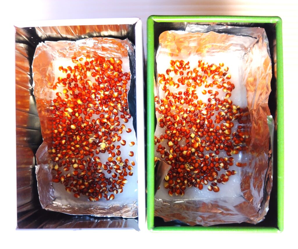 今回使用したのは、100円ショップのミニチュアコンテナ容器です。蓋付きタイプを選びました。発芽までは暗い環境を好むため、蓋があると遮光できて便利です。