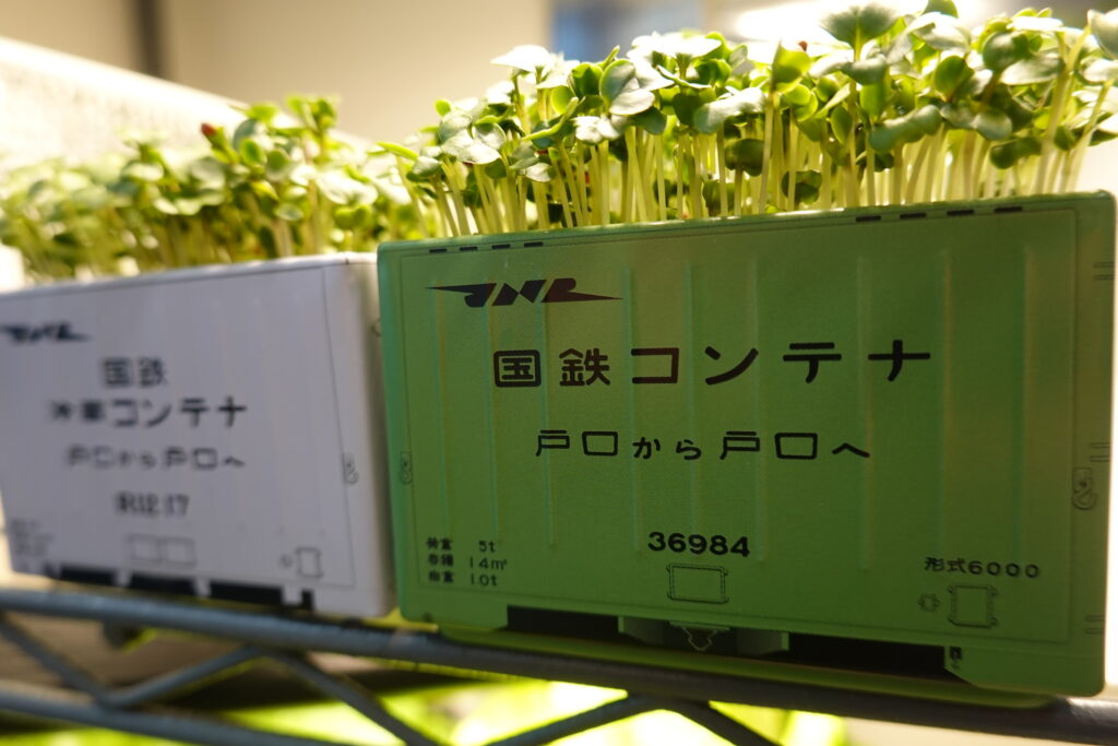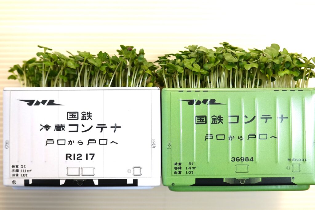 1週間ほどで双葉がしっかり開きました。ミニチュアコンテナの高さまで成長してきました。