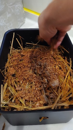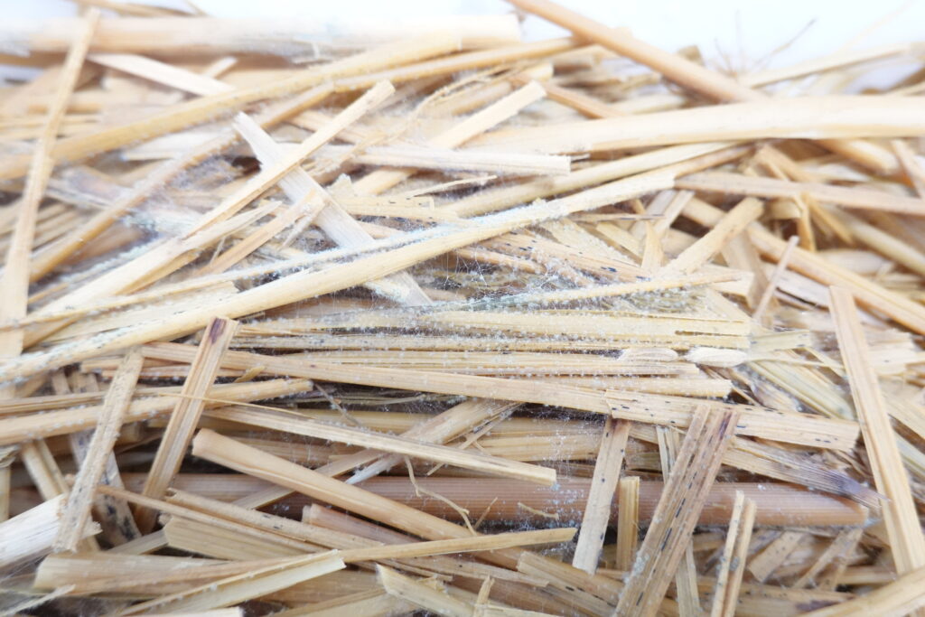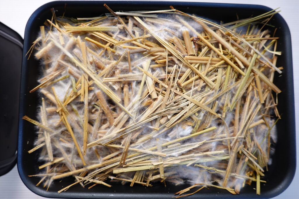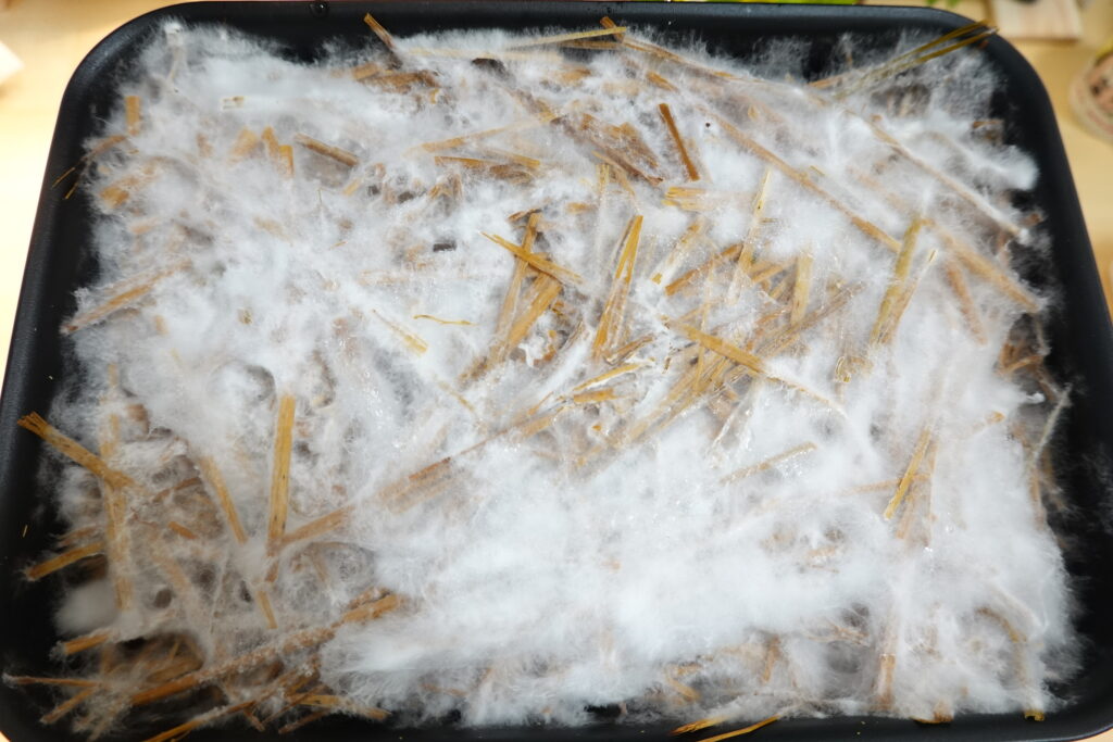 徐々に菌糸が広がり、稲わら全体を覆うようになってきました。