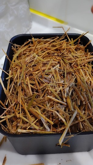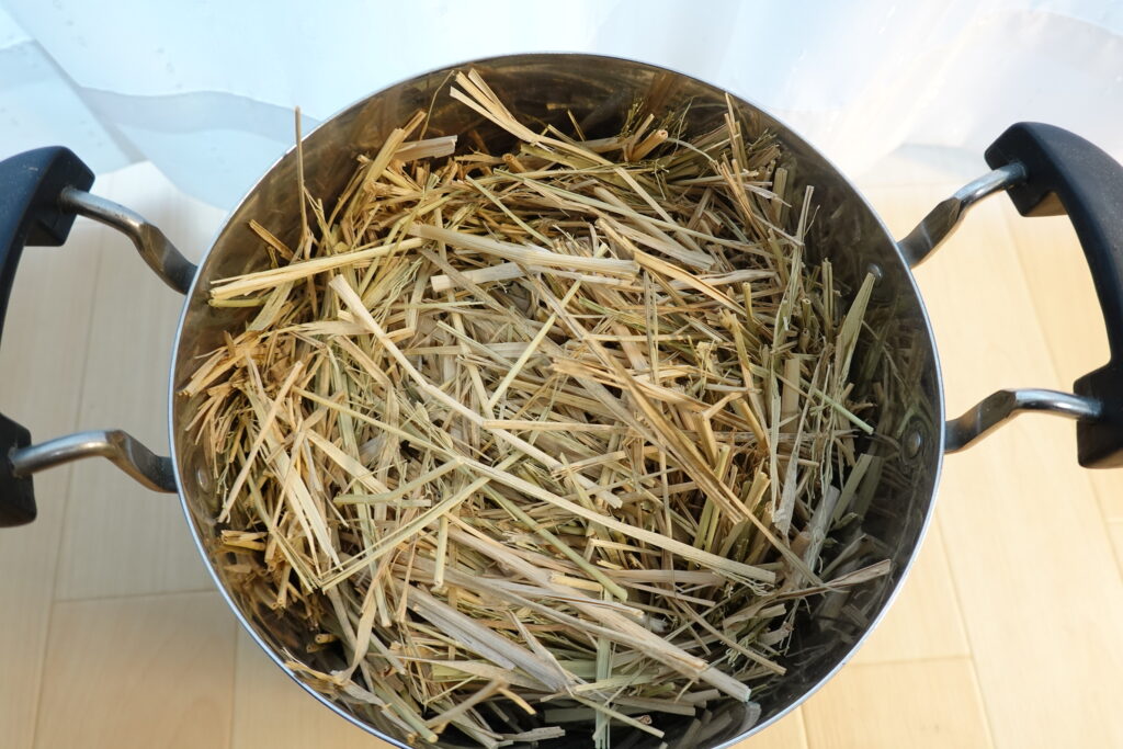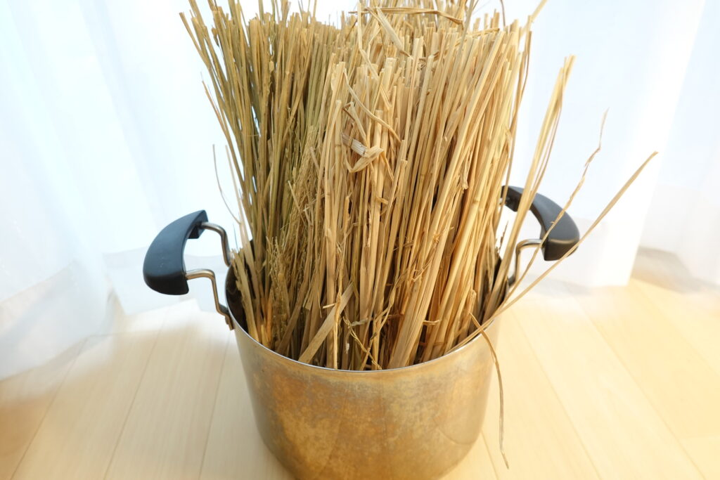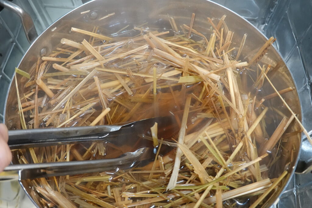 稲わらはそのままだと鍋からはみ出してしまうため、煮沸消毒しやすいようにハサミでカットしました。