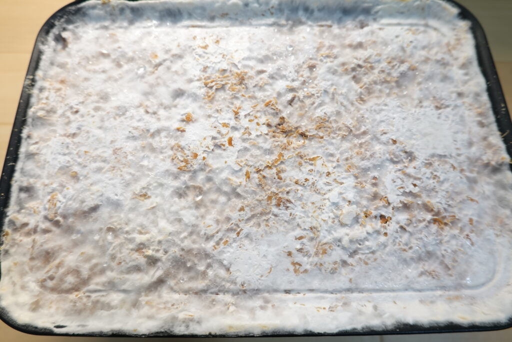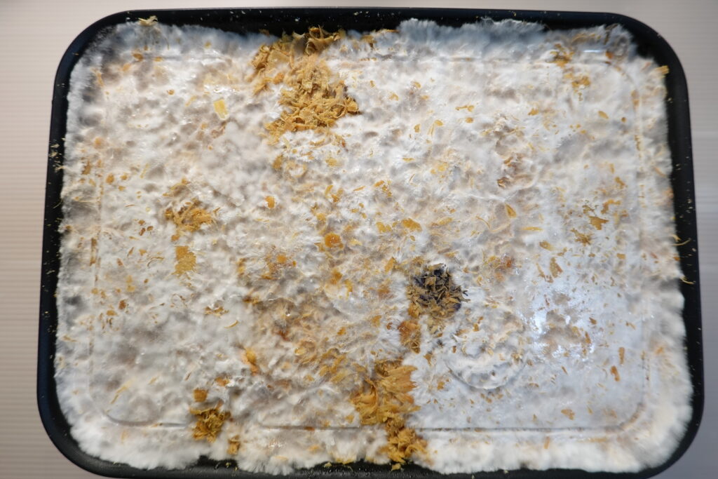徐々に菌糸が広がり、全体に回り始めてきました。ふわふわとした白い綿菓子のような菌糸が付着しています。