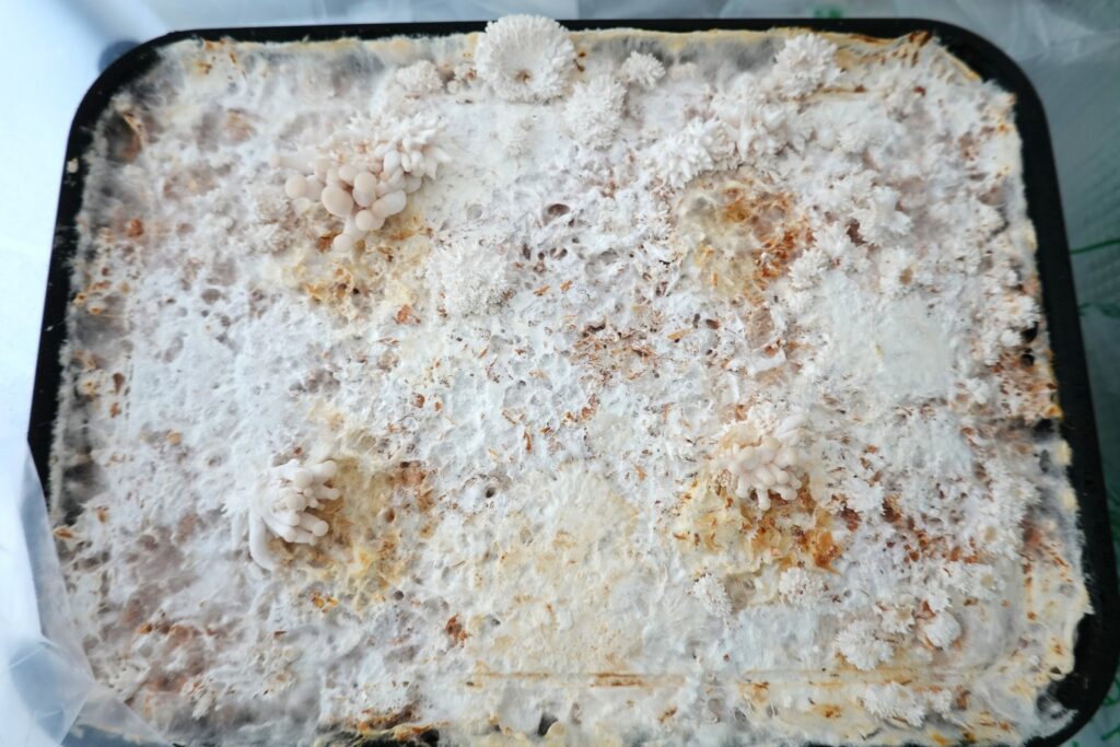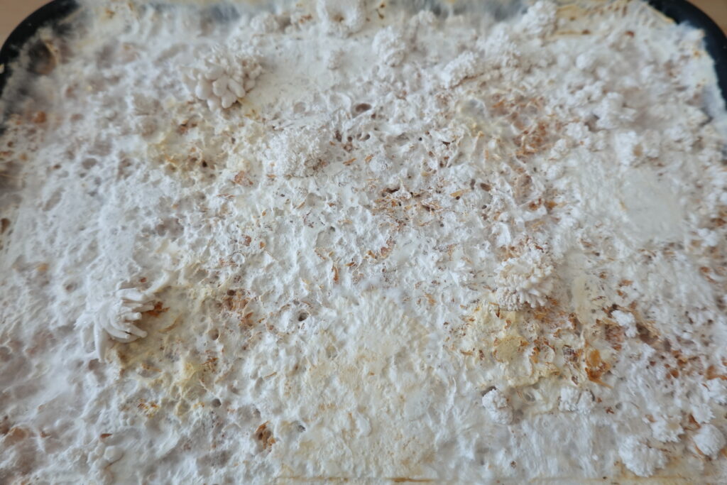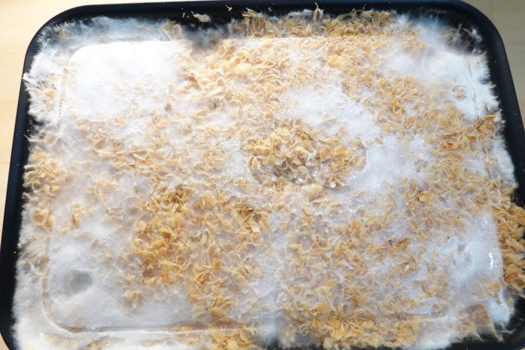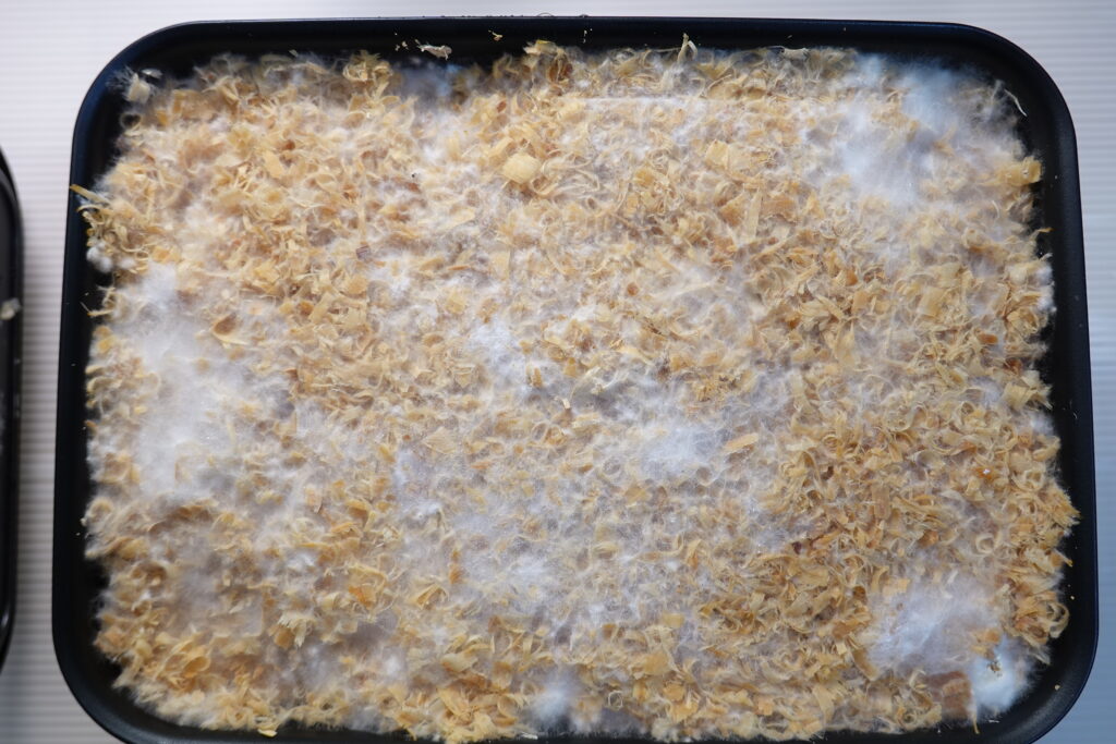表面には菌糸がびっしりと広がり、おがくず全体を覆うようになってきました。