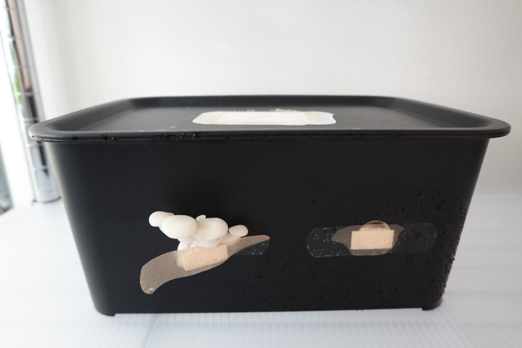 容器を見ると、乾燥防止のために貼っていた絆創膏から、菌糸が溢れているのが確認できます。