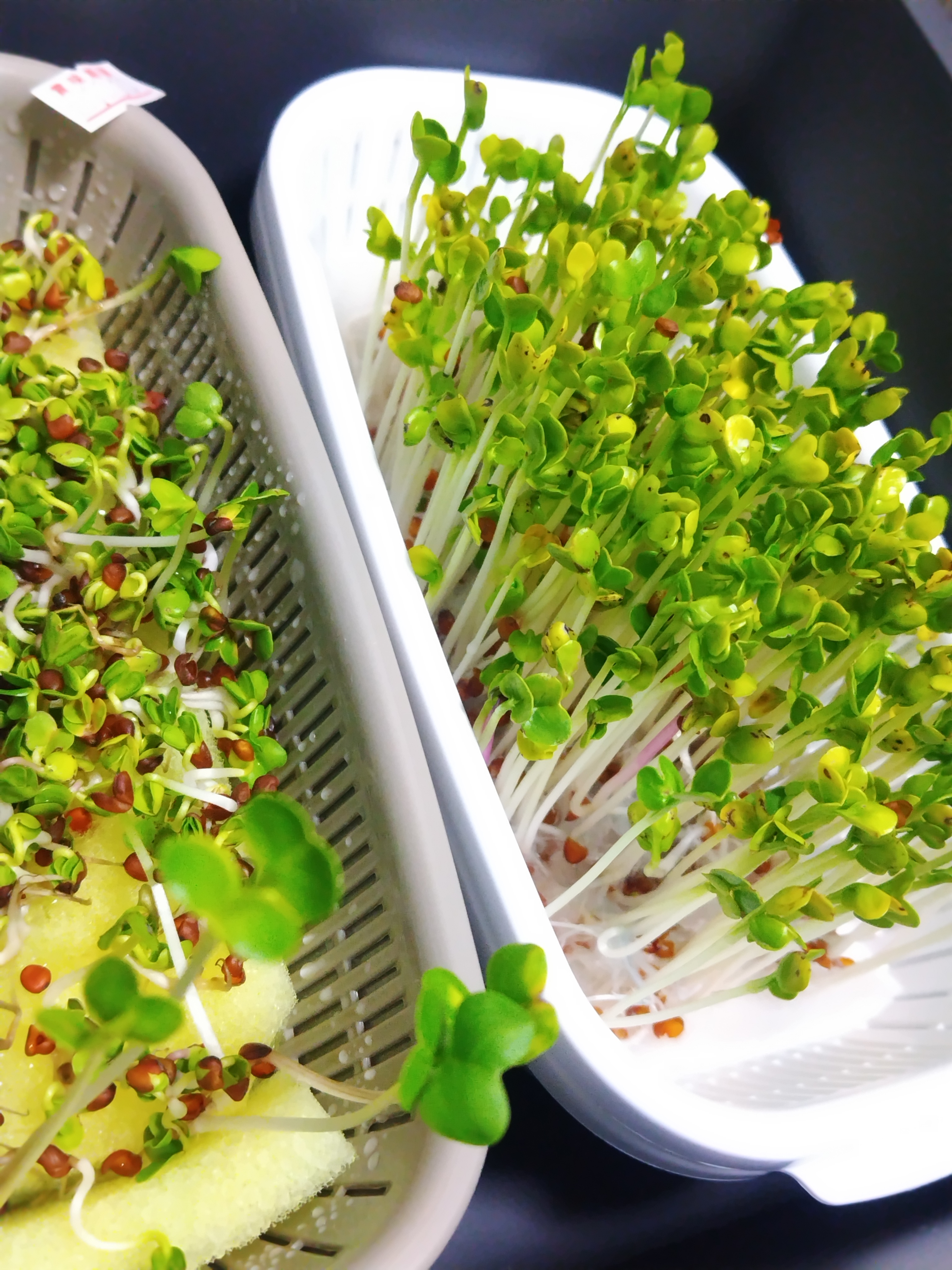 一方、直播きとキッチンペーパーで育てているスプラウトは、わずか1日で成長が見られ、はっきりと伸びを感じました。発芽も順調で、このまま問題なく育ちそうです。