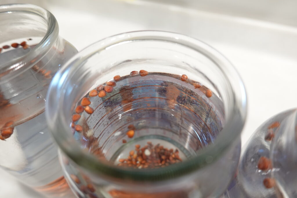 種まき前に水へ浸し、浮いた種は除去しました。