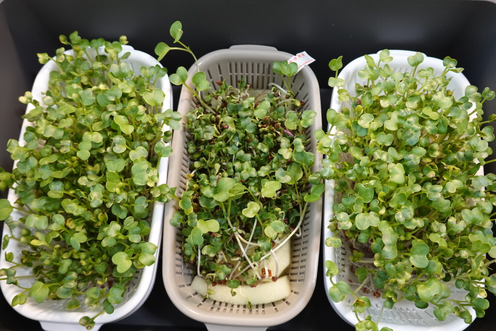 ザルボウルへの直播き・スポンジ・キッチンペーパーの3種類で水耕栽培を行い、発芽率・成長スピード・収穫量を比較検証しました。