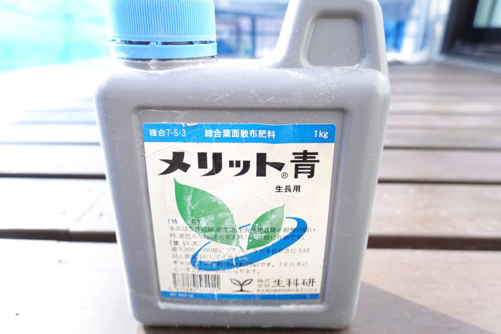 メリット青とは、株式会社生科研さんから発売されている葉面散布肥料です。メリットシリーズには青・黄・赤の3種類があり、それぞれ用途が異なります。その中でもメリット青は窒素成分が強化されており、マンガン・ホウ素・鉄・銅などの微量要素も含まれています。主な効果としては、・萌芽の促進・芽揃いの改善・展葉の促進などが期待されています。