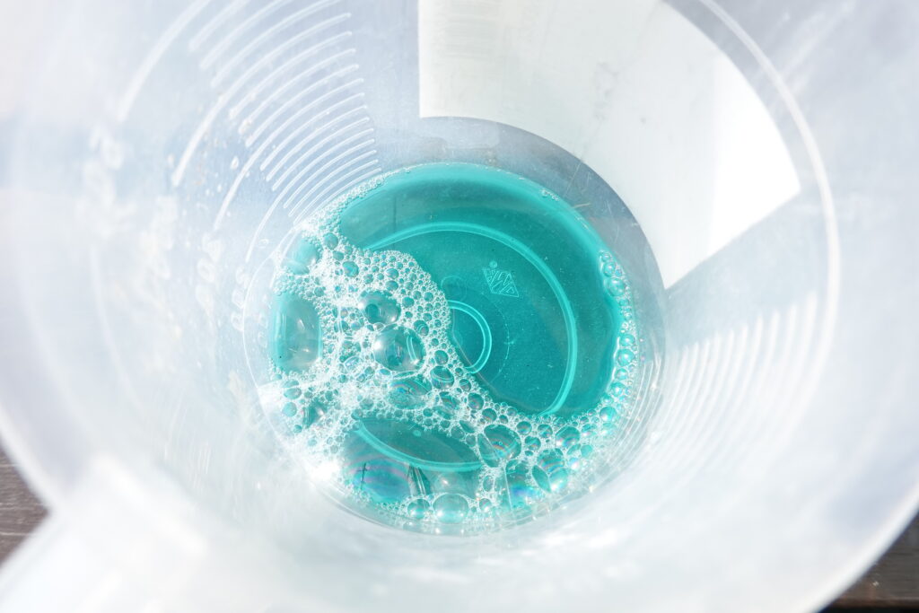 塗布に必要な道具は、容器とハケだけで十分です。YouTubeでは芽の部分のみ塗布や霧吹きで散布している例も多く見られますが、家庭菜園では塗布面積が限られているため、今回は芽だけでなく枝にもハケで塗布しました。我が家では10分くらいで処理完了です。