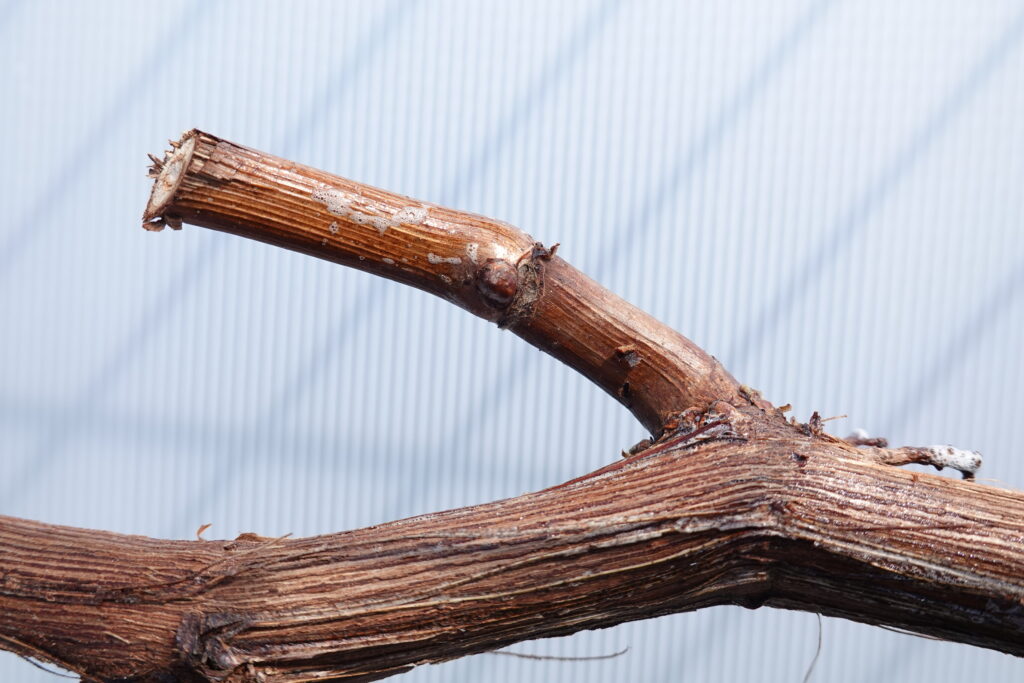 ブドウには「頂芽優勢」という性質があり、枝の先端の芽から優先的に成長します。そのため今回は、あえて先端の2芽は塗布せず、先端から3芽目以降、基部に向かって塗布しました。