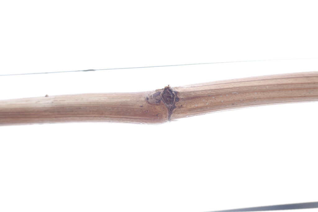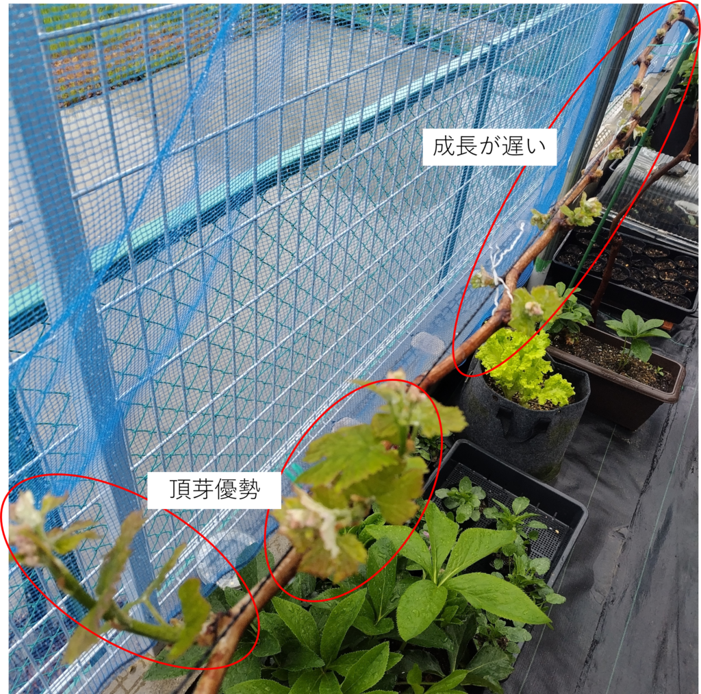 昨年の栽培では、先端の芽は特に処理をしなくても強く生育する一方で、中間から基部に向かって萌芽が遅れる傾向がありました。その結果、先端2芽を摘むことで全体の生育バランスを調整した経緯があります。その分、収量は2芽分減ることになりました。