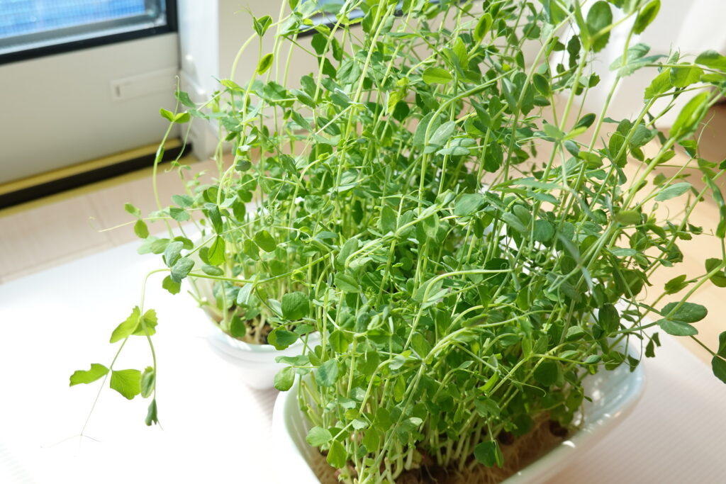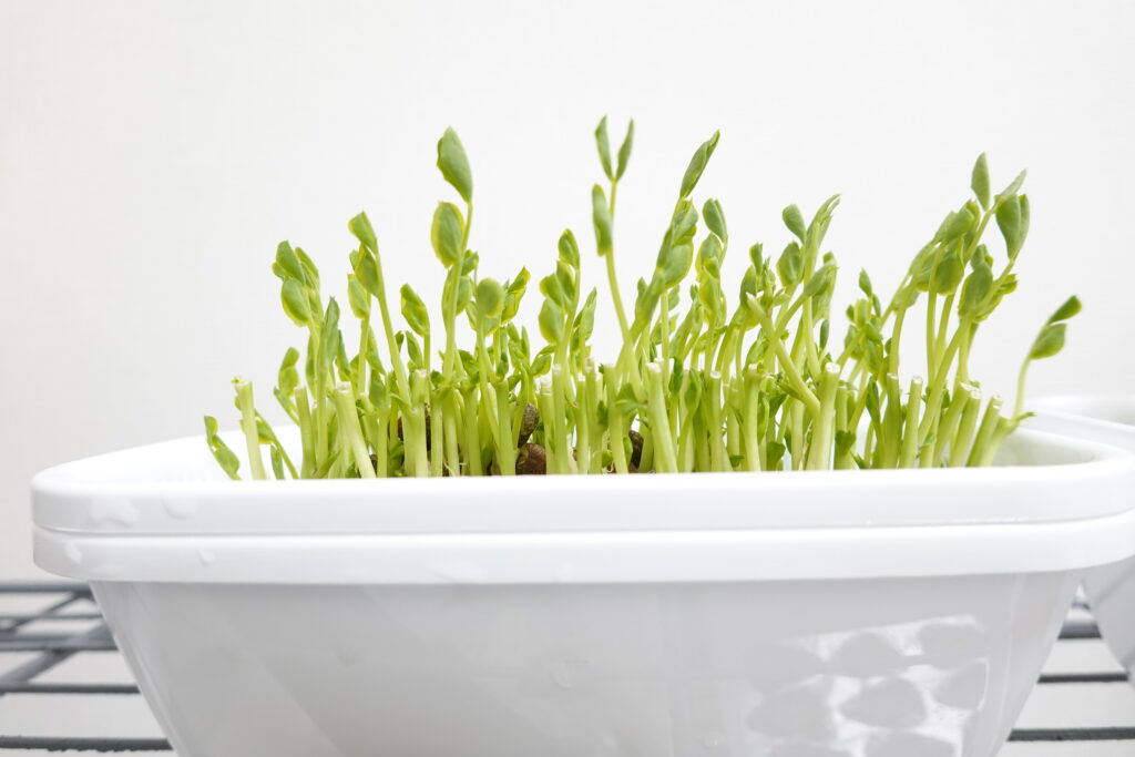 豆苗はえんどう豆の新芽で、緑黄色野菜のひとつです。シャキシャキとした食感とクセの少ない味が特徴で、炒め物やスープ、サラダなど幅広い料理に使えます。ビタミンや食物繊維も豊富で、手軽に栄養を摂れる点も魅力です。また、水だけで再生できるため、節約志向の方や家庭菜園初心者からも人気を集めています。