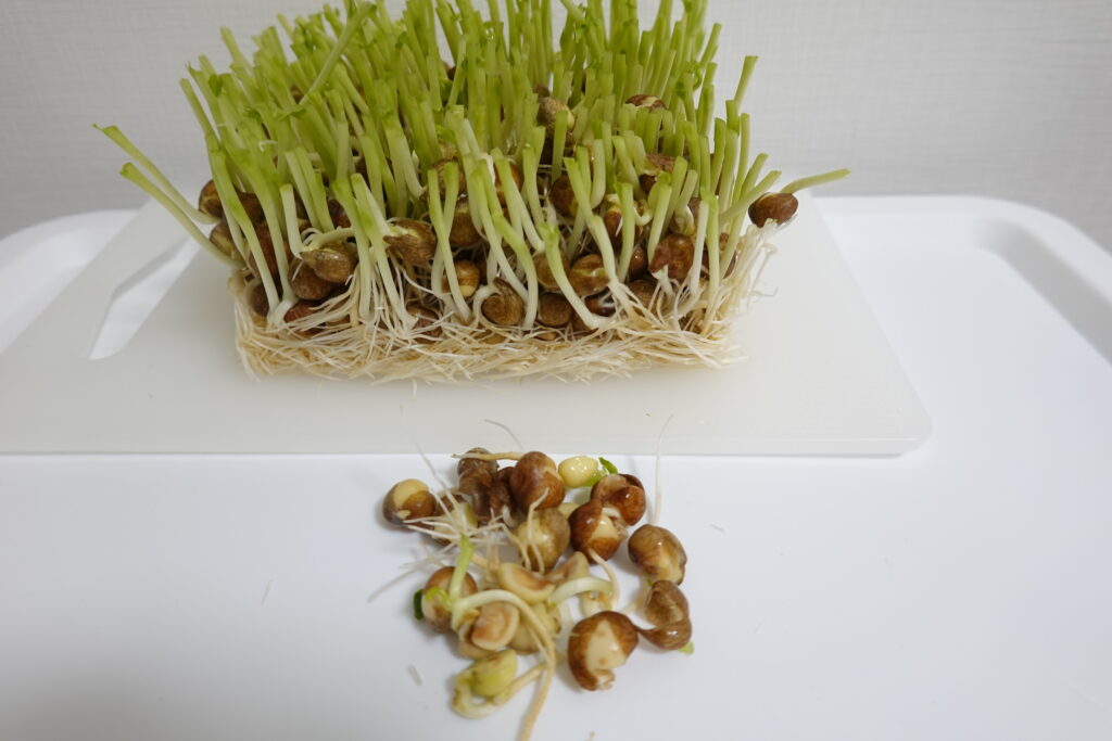 育てる前の注意点として、発芽していない豆や、根は出ているものの芽が出ていない豆が混ざっている場合があります。これらは水分が多い環境ではカビの原因になりやすいため、見つけたら取り除いておくと安心です。ひと手間かけることで、その後の生育が安定します