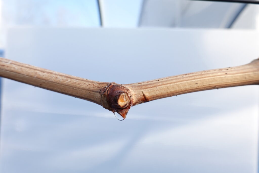 水揚げとは、冬のあいだ休んでいたブドウの根が活動を再開し、水を吸い上げ始めることです。