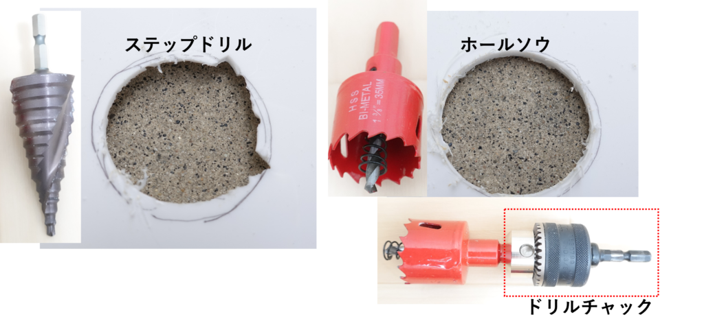 円形の穴をあけるには、ホールソーやステップドリルを使います。