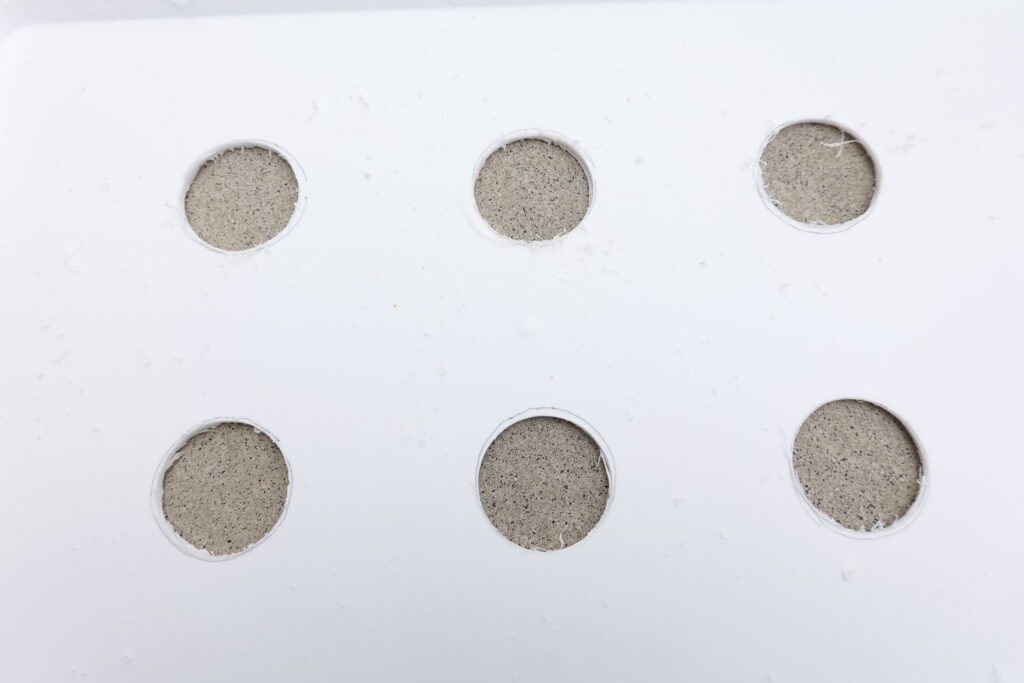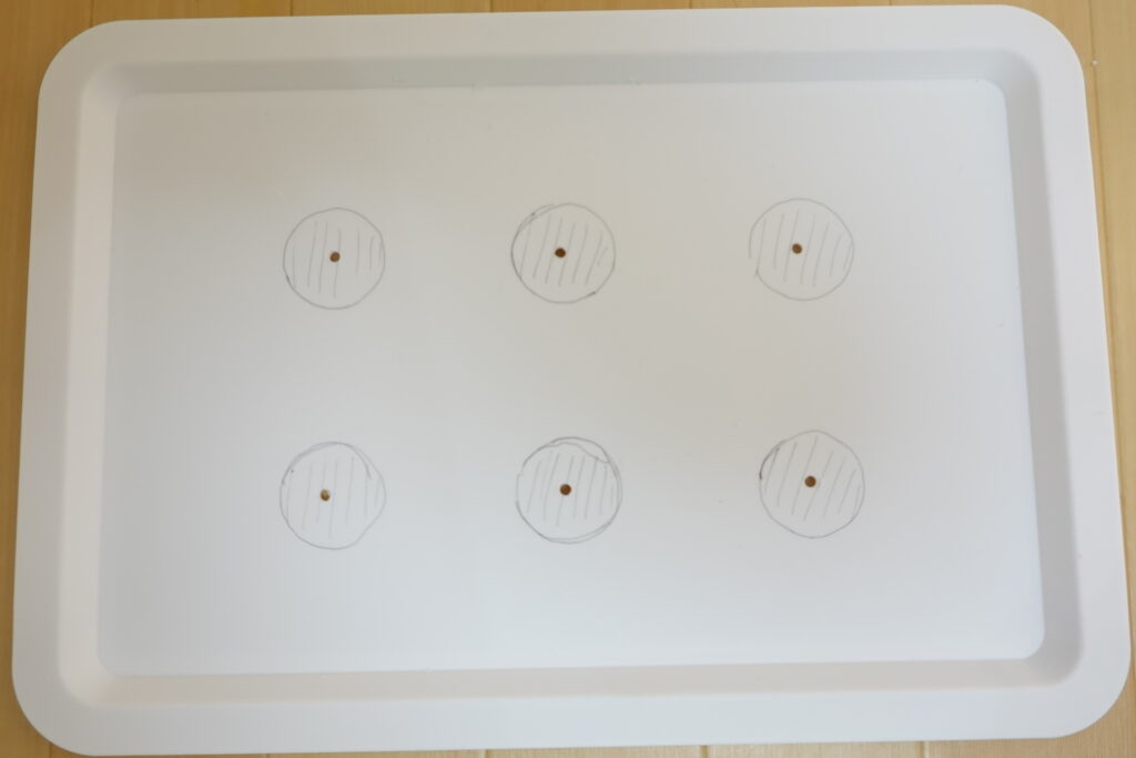 発泡なんでも板A4に、種まき用の穴位置を決めます。鉢底ネットを置き、隙間からペンで丸印をつけていきます。