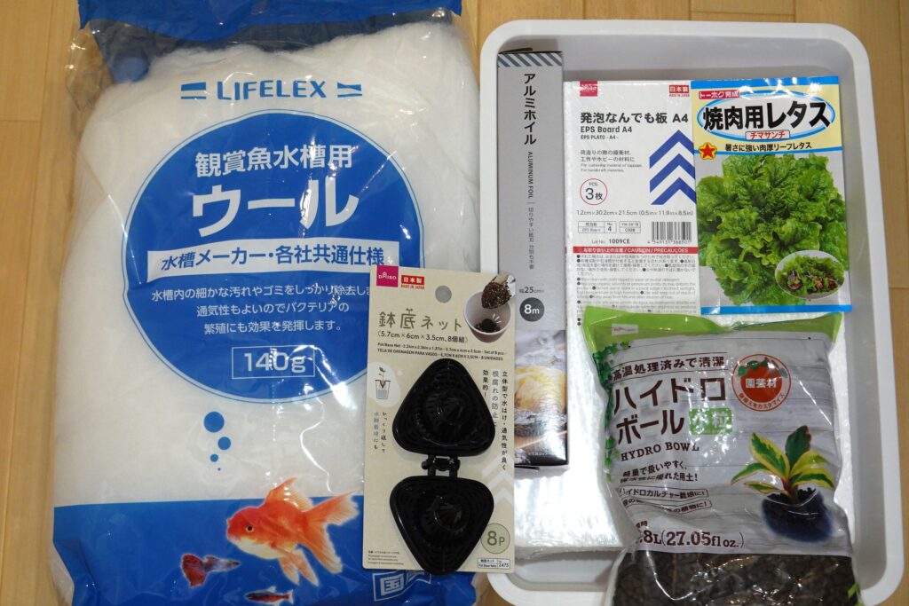 観賞魚用ウール以外は、ほぼ100円ショップで揃います。(お店によっては水槽ウールが売っているようです。)初期費用も抑えられ、気軽にスタートできます。