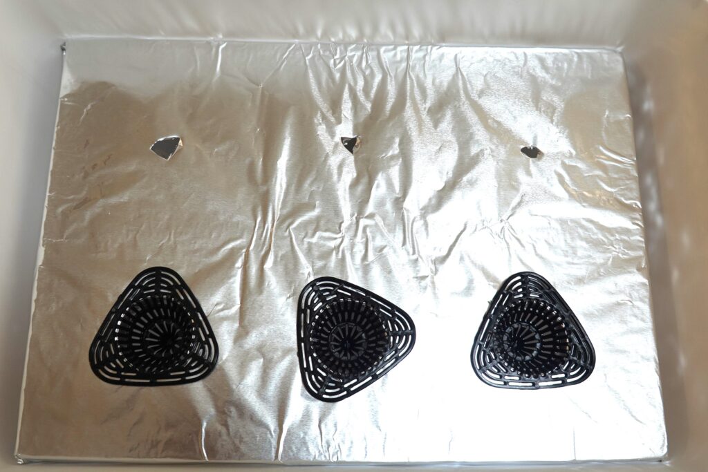 穴をあけた後は、発泡スチロールの表面にアルミホイルを貼った時と同じように両面テープで加工します。スクエア収納BOX用フタの穴あけが一番ハードルが高いですが、ここを乗り越えれば再利用可能な装置の完成です。